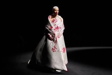 Organizado en el escenario del Teatro del Châtelet, el desfile comenzó con una modelo con la boca ensangrentada llevando un grueso vestido blanco, como si todavía estuviera envuelta en su edredón, con marcas de manos rojas con lentejuelas, como testimonio de una noche agitada.
