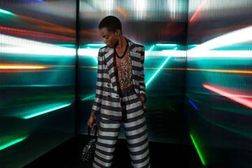 Respondiendo así al nuevo aire relajado y cómodo que se viene imponiendo en el ámbito de la moda, de una manera más acuciada desde la irrupción de esta pandemia por coronavirus, pero sin rechazar en ningún momento la sofisticación tan característica de la casa italiana, pudimos descubrir unas colecciones para hombre y mujer atrevidas y colmadas de referencias ochenteras. Una sucesión de prendas construidas sobre una paleta cromática de negros y grises, junto a coloridos acentos en rosa fucsia, azules y violáceos, que destacaron por sus marcadas líneas holgadas y por la presencia de piezas como chaquetas tipo batín y abrigos de pelo. Prendas que se mostraban combinadas con detalles como corbatines en forma de lazo o unas finas corbatas al más puro estilo Annie Hall.