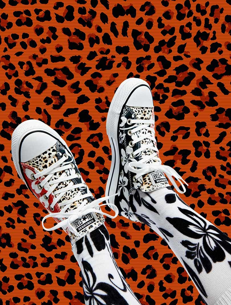 Para chica, el clásico Chuck Taylor bajo (también en una versión con suela de cuña) y el Chuck Taylor alto con versiones en monocolor y estampados de serpiente, de tigre, o con motivos havaianos para lucir en total look, con prendas y calcetines a juego.