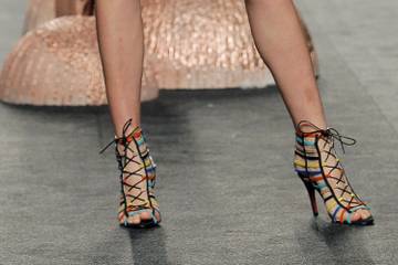 Cuplé por su parte diseñó un calzado muy divertido, lleno de texturas y colores metálicos que resaltaron sin duda en la pasarela. Para complementarse con las vibraciones setenteras de los looks creados por Ion Fiz se diseñaron zapatos con acabados en charol, piel, telas acolchadas y serraje. En cuanto a estilos resaltaron unos emblemáticos botines bicolores, sandalias jaula, tacones con un toque de sensualidad, salones de altura, botas de caña alta a la rodilla para trench de estilo Halston y mucho más. Los diversos colores fueron los protagonistas y se complementaron a la perfección con los diseños de Ion Fiz.