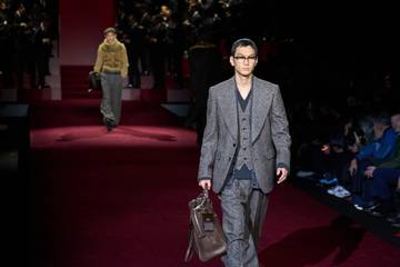 La primera parte del espectáculo se centró en la vida de esos actores imaginarios, que salen de su casa con jeans, zapatillas y jerséis de cuello alto, pero también se ponen abrigos largos de piel sintética, e incluso con estampados de leopardo. Pantalones holgados y fluidos, en denim, pana o cuero, a menudo con doble cinturón, se combinan con abrigos ajustados, cárdigans o cazadoras voluminosas. La boina gavroche y los bolsos de mano siguen siendo accesorios indispensables para el hombre de Dolce & Gabbana.