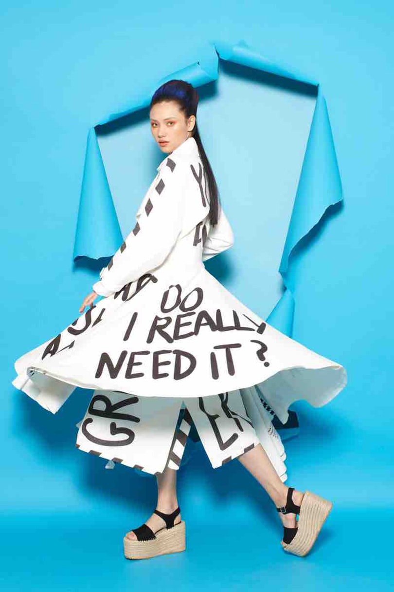 Así es. Incorporo frases reivindicativas pero siempre manteniendo la forma de la prenda, fusionándola. Quería cuestionar, empoderar y educar al consumidor para transformarlo en un consumidor plenamente consciente de sus actos con frases como: Do I really need it?; You are powerful; Make waste great again; Buy less shit.