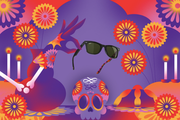 La artista se distingue por sus ilustraciones coloridas y llamativas con las que ha colaborado con otras marcas como Spotify, Ipsy e Innvictus, por mencionar algunos. La campaña con la que se promocionó esta edición limitada lleva el estilo de Ballesteros no fue la excepción. Al centro una mujer con detalles de catrina con una larga trenza adornada con flores porta las gafas. A ambos costados de la mujer hay un par de perros xoloitzcuintles, la raza que era venerada en tiempos prehispánicos por ser guardianes de los espíritus que guiaban a las almas de los fallecidos por el camino por Mictlán, la ciudad de los muertos.