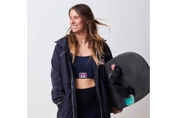 Desde estas directrices generales, para lo que atañe al caso concreto de Lauriane Nolot y del kitesurf como nueva disciplina olímpica, la dos veces campeona de Europa y del mundo de kitesurf, ideó junto al equipo de diseño de Etam un cortavientos largo impermeable en un intenso azul océano (89,99 euros). Un diseño combinado, en su misma identidad de color y con un emblema bordado con la fecha 2024 como elemento distintivo de cada pieza, con un conjunto interior compuesto por una falda corta elástica deportiva (29,99 euros), y por un conjunto multifuncional que puede emplearse como traje de baño o prenda de moda íntima, compuesto de braguita brasileña (22,99 euros) con sujetador tipo bralette a juego (39,99 euros). Un conjunto que es el que ha sido confeccionado a partir del tejido Power 3 de Pyratex; una fibra de base en madera de origen biológica que imita a las prestaciones de los tejidos sintéticos habitualmente empleados para la fabricación de los trajes de baño.
