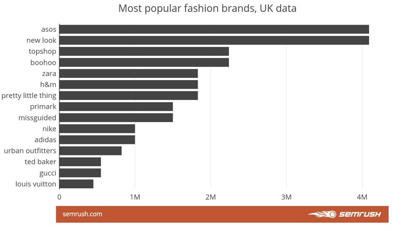 Cuando se trata de consumidores del Reino Unido que buscan sus marcas de moda favoritas, la moda rápida asequible es la ganadora, con Asos y New Look compartiendo el primer puesto con más de 4 millones de búsquedas, seguidos por Topshop y Boohoo en segundo lugar con más de 2 millones.