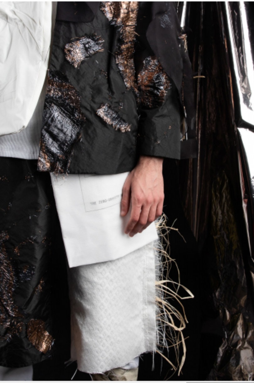 Los creadores combinaron telas técnicas y futuristas con materiales que evocan la tierra y transmiten la melancolía terrestre-tecnológica. Los materiales terrestres incluidos son: rafia, paja, semillas y flores secas.