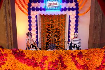La marca nuevamente hizo uso de la frase “JPG Loves México” para nombrar el altar en donde se conjuntan el estilo de la maison con las piezas creadas por artesanos mexicanos. Envueltos en rayas azul y blanco, icónicas de la firma, cada uno de los escalones del altar tiene artesanías de Oaxaca y Michoacán rodeadas de papel picado y flores de cempasúchil. Varios de los elementos típicos del altar fueron reinterpretados al estilo de la marca agregando detalles como, estampados así como vistiendo las calaveritas con flores y encajes. El papel picado que adorna el espacio además se combina con el estampado papel moneda que remite a los diseños de Gaultier de la década de los 90.