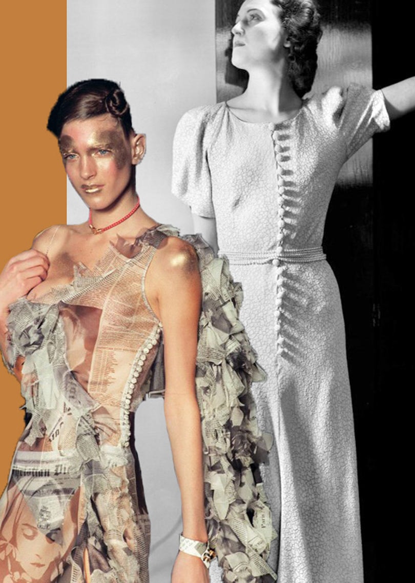 Fotos: Primavera Verano 2019 Maison Margiela, Catwalkpictures; Madeleine Vionnet Negro/Blanco Albin Guillot /Roger-Viollet /AFP; Madeleine Vionnet vestido dorado Francois Guillot /AFP; Wikimedia Commons: Hombre cortando ropa North Carolina, Lewis Hine, U.S. National Archives and Records, NARA 518485; Obra de arte para el diseño de moda Madeleine Vionnet, Madeleine Vionnet, puristas de la moda (lesartsdecoratifs) -Will; Ilustración. Figurín de un vestido de Madeleine Vionnet visto por el delantero y la espalda. Fábrica de Bordados (Barcelona) Casa H. Estévez - Museo del Traje; modelo, posando en un vestido inspirado en Vionnet en la década de 1930, Biblioteca Estatal de Queensland, Australia, fuente flickr.com; Vestido de acetato gris Azzedine Alaia de 1986-1987 ellenm1