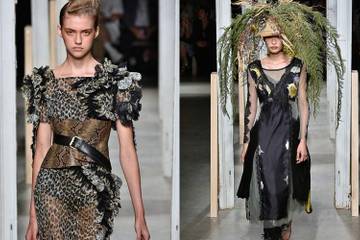 Algunos modelos llevan sombreros de paja como los de los campesinos del sudeste asiático, pero decorados con imponentes composiciones de plantas y flores.