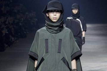 Al igual que para la colección de moda masculina, domina el tema de la protección, con modelos envueltas en capuchas, capas y ponchos, mantas gráficas y largos guantes.