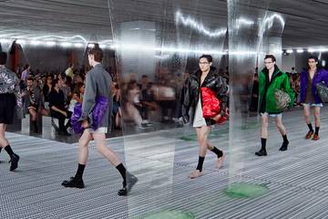 Desde la inmersiva atmósfera construida por la casa en el área de Deposito de la Fondazione Prada, donde una pasarela de tonalidades metálicas terminó por vestirse, al igual que los modelos, de unas paredes fluidas y translúcidas que se encargaron de aportar un plus de dinamismo —y de espectacularidad— a la presentación, Miuccia Prada y Raf Simons terminaron por mostrar un propuesta construida sobre una suave y variada paleta de tonalidades neutras, asentada sobre negros, tonalidades arenas y grises. Colores a los que se encargaron de poner su contrapunto la profundidad de los azules marinos y sobre todo de los negros, mientras acentos en azul, rojo, malvas, violetas y verdes se encargaban de aportar la dosis extra de color al universo imaginativo de la propuesta.