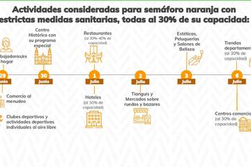 La jefa de gobierno de la Ciudad de México, Claudia Sheinbaum, anunció que la ciudad pasará al semáforo epidemiológico naranja a partir del lunes 29 de junio. Con esta transición se reactivan algunas actividades y se reabren las puertas de tiendas no esenciales, entre ellas centros comerciales y tiendas departamentales.