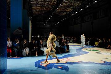 La atención se centra en elementos texturales con una apariencia de desgaste superficial “por el uso”, que se materializan en prendas envueltas en guirnaldas de hilos sueltos y tiras de tela contrastantes que se entrecruzan como el tejido de cesta para crear piezas suavemente estructuradas.