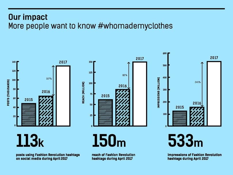 El año pasado, 2.416 marcas respondieron a las demandas de #whomademyclothes de las organizaciones al compartir más información sobre sus cadenas de suministro. Las condiciones de trabajo para los trabajadores de la confección también han mejorado, ya que a más de 1.8 millones de trabajadores de la confección se les enseñó la información de seguridad de la fábrica de acuerdo con el Acuerdo. Además, los salarios mínimos para los trabajadores de prendas de vestir han aumentado en Bangladesh, con el gobierno implementando un aumento del 77 por ciento en el salario mínimo a 68 dólares estadounidenses por mes. Sin embargo, este aumento no coincide con el aumento de la inflación ni explica el hecho de que muchos trabajadores de la confección todavía ganan menos que el salario mínimo legal. Un informe de Global Living Wage Coalition de 2016 indicó que un salario digno en Bangladesh debería oscilar entre 177 dólares estadounidenses por mes y 214 dólares estadounidenses, dependiendo de la región, lo que significa que la mayoría de los trabajadores de la confección están atrapados en un ciclo de pobreza.