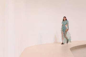 En Saint Laurent, Anthony Vaccarello explora con una nostalgia conmovedora el propio guardarropa del creador para vestir a las mujeres con un look "Yves". Cincuenta y ocho años después de que la casa presentara el primer "smoking para mujer", el belga imaginó una serie de grandes drapeados de lana, trajes masculinos sobredimensionados, con hombros marcados, que junto con las icónicas gafas cuadradas del fundador, crean una impresionante apariencia andrógina.