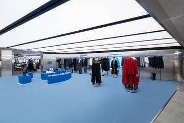 En relación con esta misma cuestión, en lo que refiere a esta nueva tienda de Pull&Bear en París, la tienda vuelve a descubrirse a ojos de sus clientes desde la estética minimalista e industrial que viene sirviendo de base de su nuevo concepto de tienda desde el pasado abril de 2023. Una imagen construida a partir de elementos translúcidos y de recubrimientos metálicos, a los que como novedad y principal atractivo visual han sumado un rincón, ubicado dentro de la misma tienda, en el que sorprenden su futurístico techo formado a partir de franjas de luz, así como su colorido suelo baño de un profundo azul cerúleo. Una luz y un color que, sumados a los paneles de aluminio y de chapa metalizada, son los que terminan de generar esa impresión tan cercana a la que ofrecen las estéticas de las nuevas tiendas de Yuxus, y en especial la de su tienda de Valencia o la de sus córneres en los centros comerciales de El Corte Inglés.